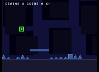 4 levels with increasing difficulty · Practice mode with checkpoints · Attempt counter and best-run tracking · Per-level music · Title screen, level select, and win screen · Memory card save support